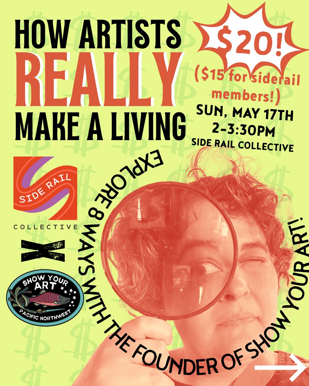 Sarah Miller, Founder of Show Your Art PNW will break down how sustainable artist income really works. Beyond (but in addition to) gallery sales, this is a solid first look at how artists combine multiple income streams in real life. You’ll learn about and dissect local examples, and learn and utilize the different paths artists are using right now to make a full time living as an artist.